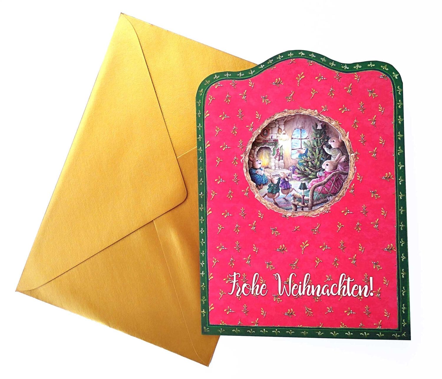 SAMTENE GRUßKARTEN MIT GEHEIMNISJede dieser verschieden geformten Papierkarten im Silhouettenschnitt erzählt eine ganz besondere Geschichte und ist eine wunderbare Art und Weise Grüße und Wünsche den Liebsten zu schenken. Die Innenseite ist genauso detalliert und liebevoll gestaltet, was noch mehr Gute Laune für Ihre Liebsten mit sich bringt. Die Karten werden samt Umschlag und Folienverpackung geliefert.♦ Anlass: Weihnachten ♦ Veredelung: Individuelle Stanzform, Fensterausschnitt, Samtmatte Folienkaschierung ♦ Inklusive goldenem Kuvert ♦ Innenseite vollfarbig bedruckt ♦ In Schutzbeutel verpackt
