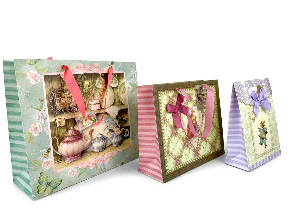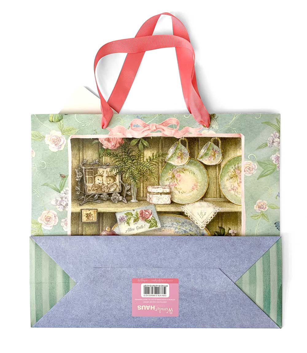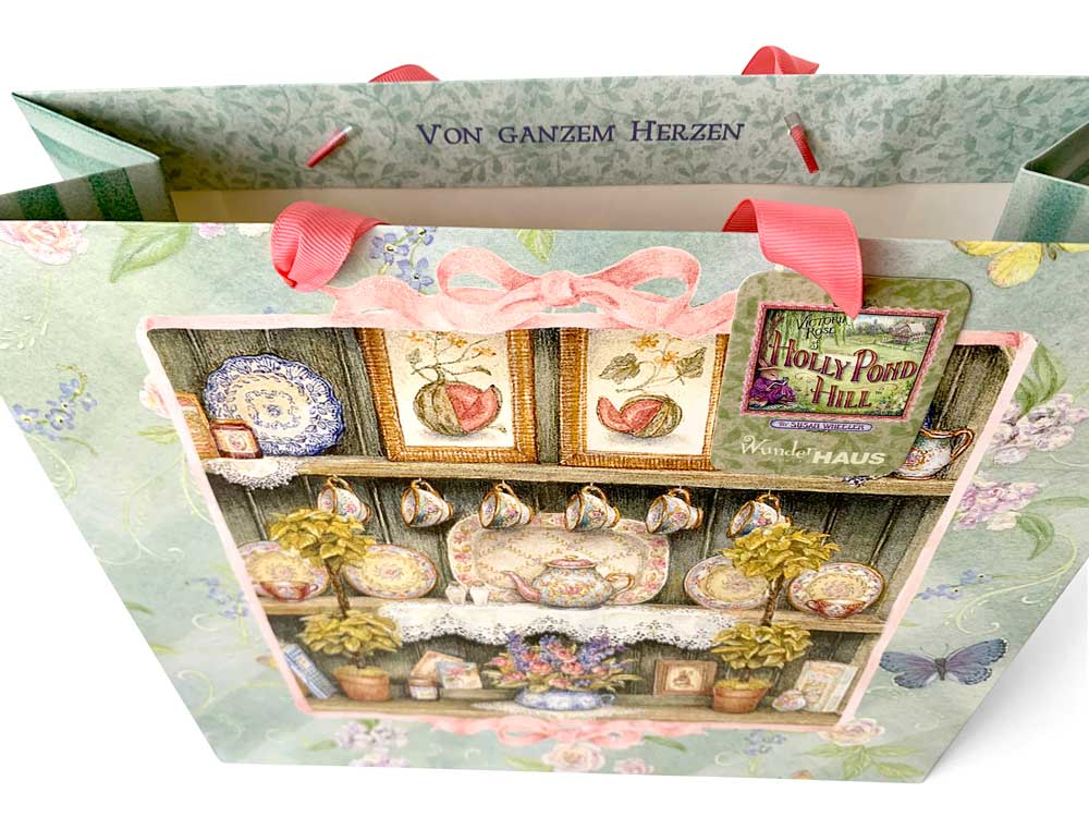 Kleine Geschenke, schön verpackt. Das geht auch ohne Geschenkpapier. Zu der exklusiven handgefertigten Papiertasche „Gemütliches Haus“ gehören Kordeln aus Satin. Die Tasche ist elegant matt laminiert und mit Glitzerelementen veredelt. Sie beschert dem Beschenkten eine fröhliche Frühjahrslaune schon bevor das Geschenk ausgepackt wird. Durch ihre Langlebigkeit ist die Tasche sehr praktisch und kann mehrmals benutzt werden.- Dekorative Kordeln aus Satin