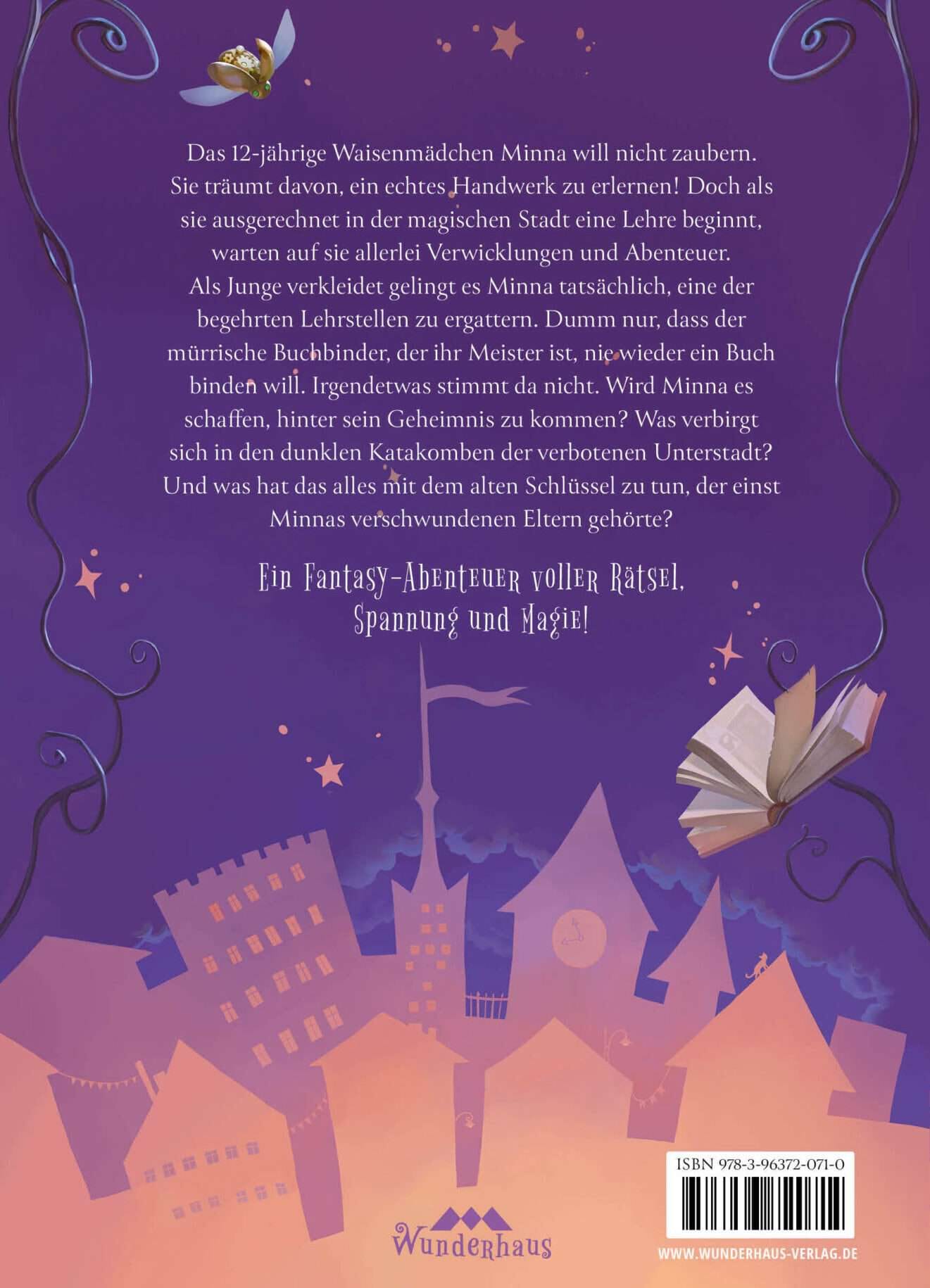 Als Junge verkleidet gelingt es Minna tatsächlich, eine der begehrten Lehrstellen zu ergattern. Dumm nur, dass der mürrische Buchbinder, bei dem sie in die Lehre geht, nie wieder ein Buch binden will. Irgendetwas stimmt da nicht. Wird Minna es schaffen, hinter sein Geheimnis zu kommen? Was verbirgt sich in den dunklen Katakomben der verbotenen Unterstadt? Und was hat das alles mit dem alten Schlüssel zu tun, der einst ihren Eltern gehörte?