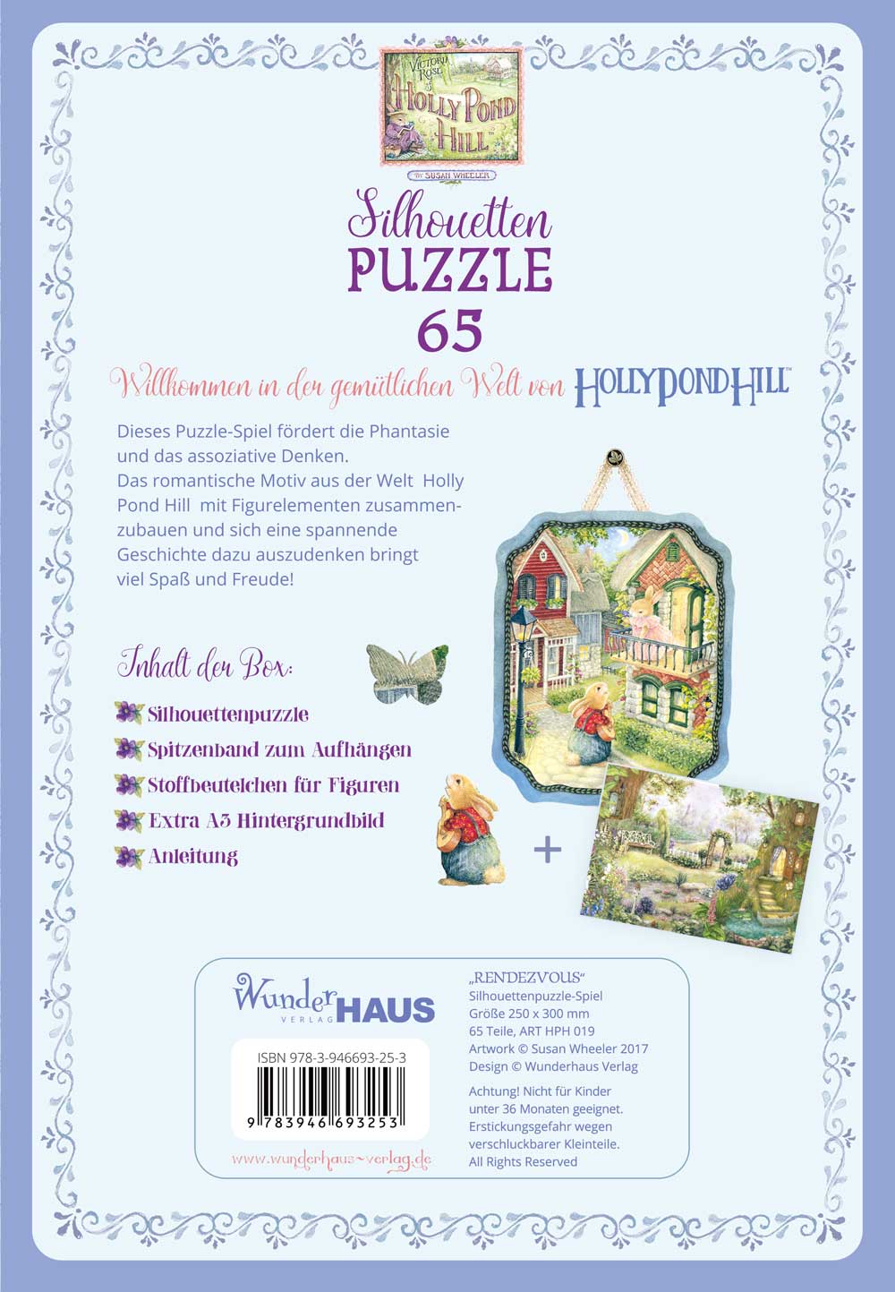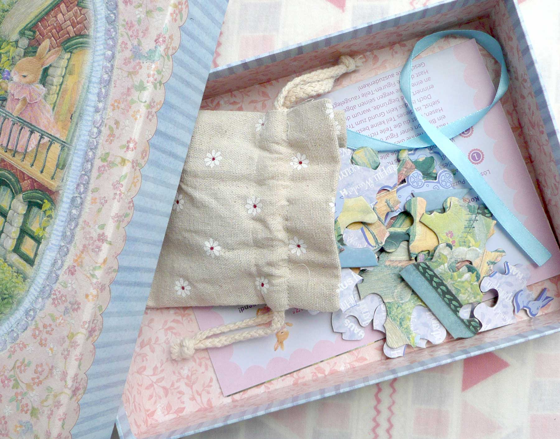 Inhalt | Puzzle 65 Teile, Box, Band zum Aufhängen, Stoffbeutelchen für Figuren, Extra Hintergrundbild, Anleitung |
