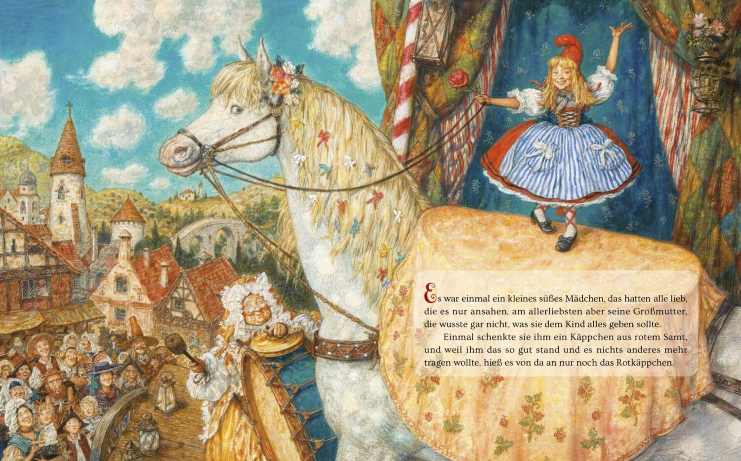 In dieser Rotkäppchen Version lädt in einem kleinen französischen Städtchen ein Wandertheater seine Zuschauer ein, in eine farbenfrohe Kulisse einzutauchen. So vergisst man schnell, dass der Klassiker Rotkäppchen und der Wolf im Buch als Theaterstück vorgeführt wird, bis zuletzt, wenn die bunten Vorhänge sich schließen und man sich als Publikum auf dem Marktplatz wiederfindet, wo die Geschichte begann.